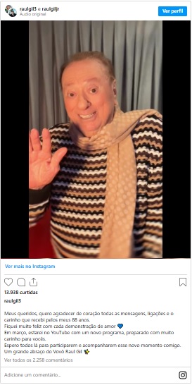 Adiante, Raul confirmou seu retorno e pediu apoio do público: “Em março, estarei no YouTube com um novo programa, preparado com muito carinho para vocês. Espero todos lá para participarem e acompanharem esse novo momento comigo. Um grande abraço do Vovô Raul Gil“, revelou o renomado apresentador da TV brasileira.
